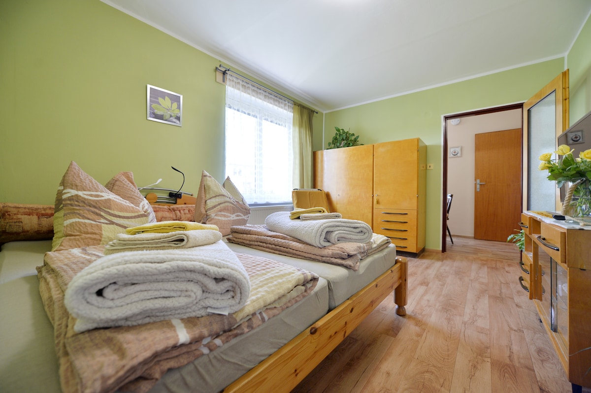 Apartmen yang baru diubahsuai di RD terletak di kawasan perumahan yang tenang di Cheb berhampiran pusat bandar. Apartmen untuk 2 orang (katil tambahan boleh disediakan dengan perjanjian) mempunyai dapur kecil persendirian dan bilik mandi. Boleh menggunakan taman dengan teres dengan pendiangan. Tempat letak kereta yang selamat secara percuma.