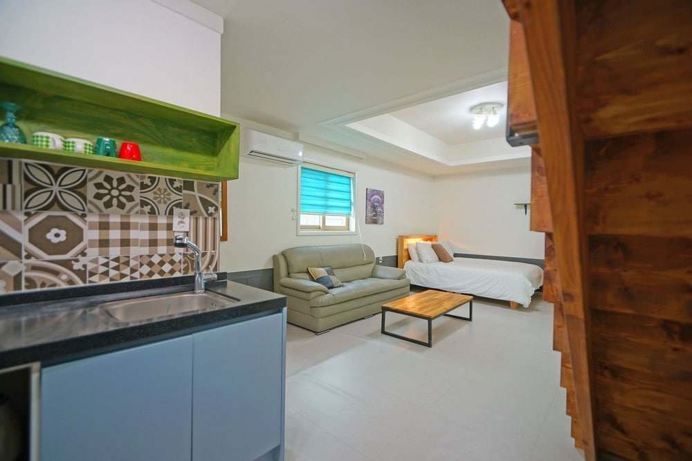 Hanok baharu dengan penampilan yang tenang, dan kayu vintaj yang menghidupkan masa untuk mencipta suasana yang mendalam. Tekstur pokok lama, yang telah dilebur secara semula jadi menjadi struktur yang dipangkas dengan licin, membawa kehangatan kepada ruang, dan bahagian dalam adalah gabungan eklektik keindahan moden dan tradisional yang menarik perhatian penonton. Apabila anda naik ke tingkat dua, anda akan menemui dunia yang berbeza sama sekali. Teres motif Bali yang eksotik dan jacuzzi membuat anda berasa selesa di bandar. Dengan perabot semula jadi, alat peraga tekstil berwarna lembut dan tumbuhan hijau, ruang ini adalah tempat yang benar-benar menyembuhkan untuk berehat badan dan fikiran anda. Dengan gabungan harmoni antara kepekaan Timur dan eksotik pada masa lalu, hanok ini adalah ruang yang mewujudkan pengalaman unik bagi mereka yang menginap, di luar rumah biasa.