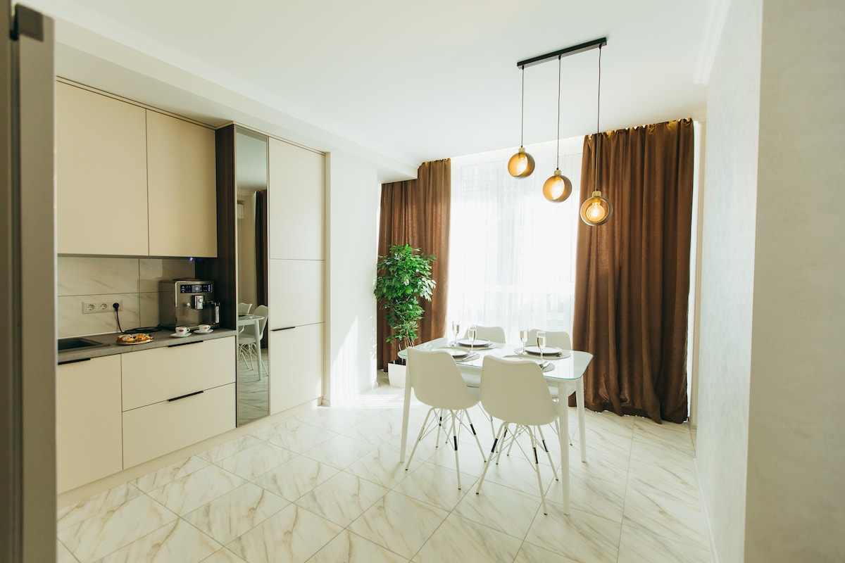 Open the door to a world of comfort and cosiness in our designer apartment located on the pedestrian street Olga Kobylianska, in the heart of Chernivtsi. We have made sure that your stay is as comfortable as possible. The apartment is equipped with everything you need for a pleasant stay: fully equipped kitchen with stove, kettle, fridge, microwave and necessary utensils; There is also a washing machine, Hairdryer and iron, Wi-Fi, TV.
