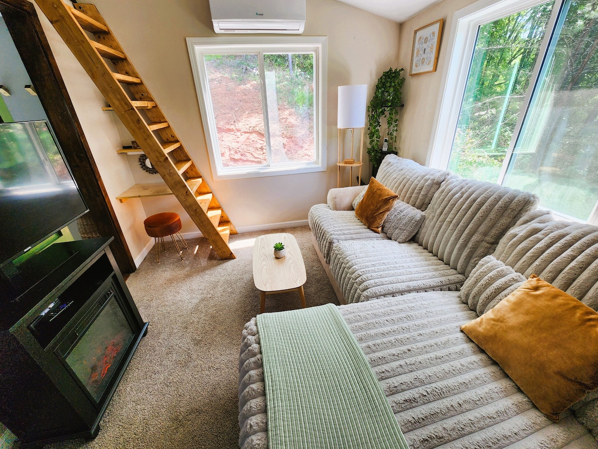 Lengkap dengan pintu masuk sendiri, wifi, sofa kulit yang selesa, katil bersaiz king atas bantal, peti sejuk mini, sinki, Keurig, dan ketuhar gelombang mikro. Adakah saya menyebut TV 50"pintar dengan HBO Max dan penstriman? Jauh lebih baik daripada hotel yang mahal! Terletak di ladang 18 ekar kami, 10 minit ke Murphy, John C. Campbell Folkschool, dan kasino Harrah; 2 minit ke tempat perkahwinan MilRace. Kami berada 30 minit ke 2 pengembaraan arung jeram: Ocoee dan Nantahala!