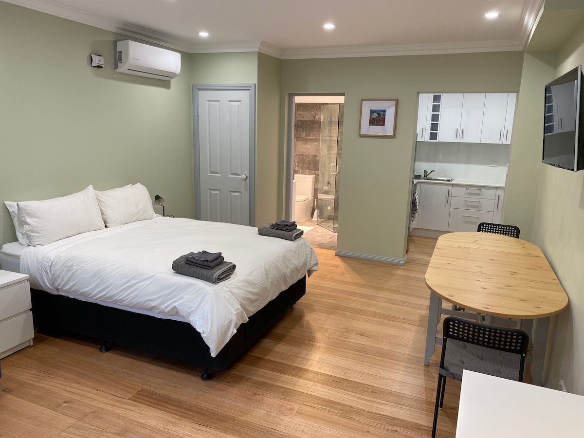 Studio yang dibina oleh Tujuan Tenang dan Persendirian. Pintu masuk dan Bilik Mandi sendiri. Kelengkapan moden dengan katil raja serta selimut elektrik pada musim sejuk. Linen mewah dan kelengkapan dandanan diri. TV Pintar, Dapur Kecil dengan bangku batu. Aircon, Microwave, pembakar roti, teh /kopi (segera dan Nespresso)Sarapan ringan disediakan. BBQ dan anjung persendirian. Almari. Mesin basuh baru. Bangun pagi dan mendengar bunyi burung. Mesra LGBTI. Tempat letak kereta berpagar selamat. Pengembara perniagaan/tetamu tetap layak untuk program kesetiaan.