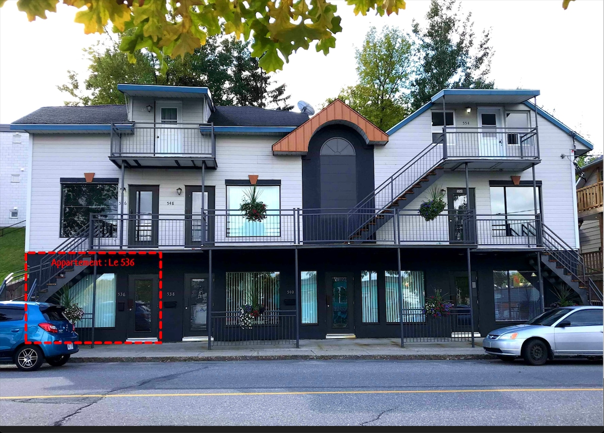 Baru, bandar dan intim 5 1/2. Di tengah-tengah bandar dan jarak berjalan kaki ke semua aktiviti sosi budaya, restoran, Place du citoyen, pelabuhan lama, muzium, rumah putih kecil, universiti, Cegep, hospital, laluan basikal dan hiking bandar, termasuk jambatan khusus untuk pejalan kaki dan penunggang basikal. Anda berada 30 menit dari Pegunungan Valin yang megah. Semua kemudahan disediakan. Nombor CITQ: 302131