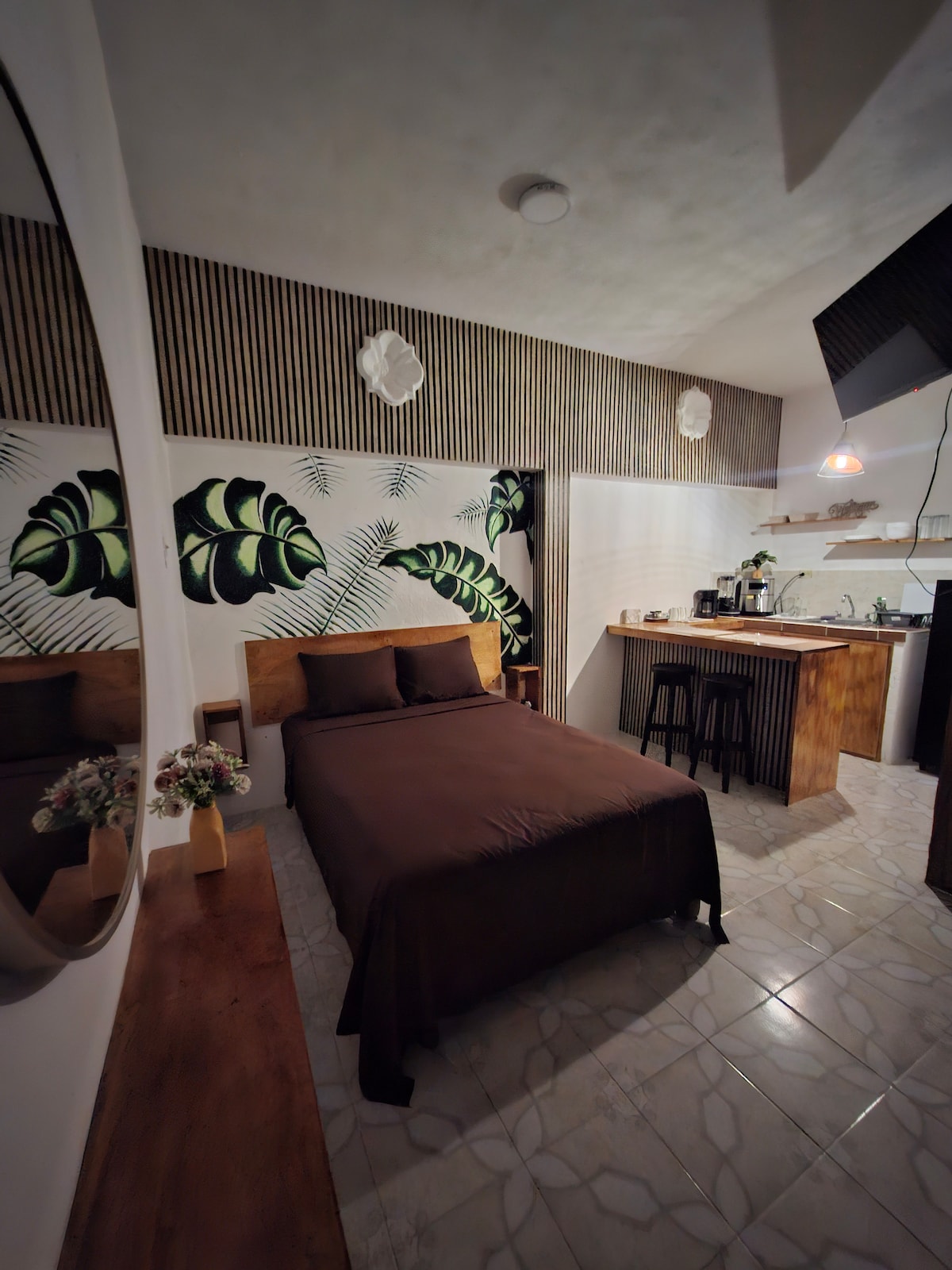 Suite perfecta para 2 personas con cama Queen, equipada con todos los servicios como: Smart TV con Netflix, Wifi, Cable, Aire Acondicionado, Agua caliente, Cocineta con Frigobar, Parrilla Eléctrica, Microondas, Licuadora, Cafetera, Utensilios de cocina, Platos, Cubiertos, etc. Ubicada en el Centro Histórico de Ciudad del Carmen, a 3 cuadras de la Iglesia del Carmen, 3 cuadras del Malecón, a 2 kms de Playa Norte y del Malecón Costero cerca de bancos y restaurantes.