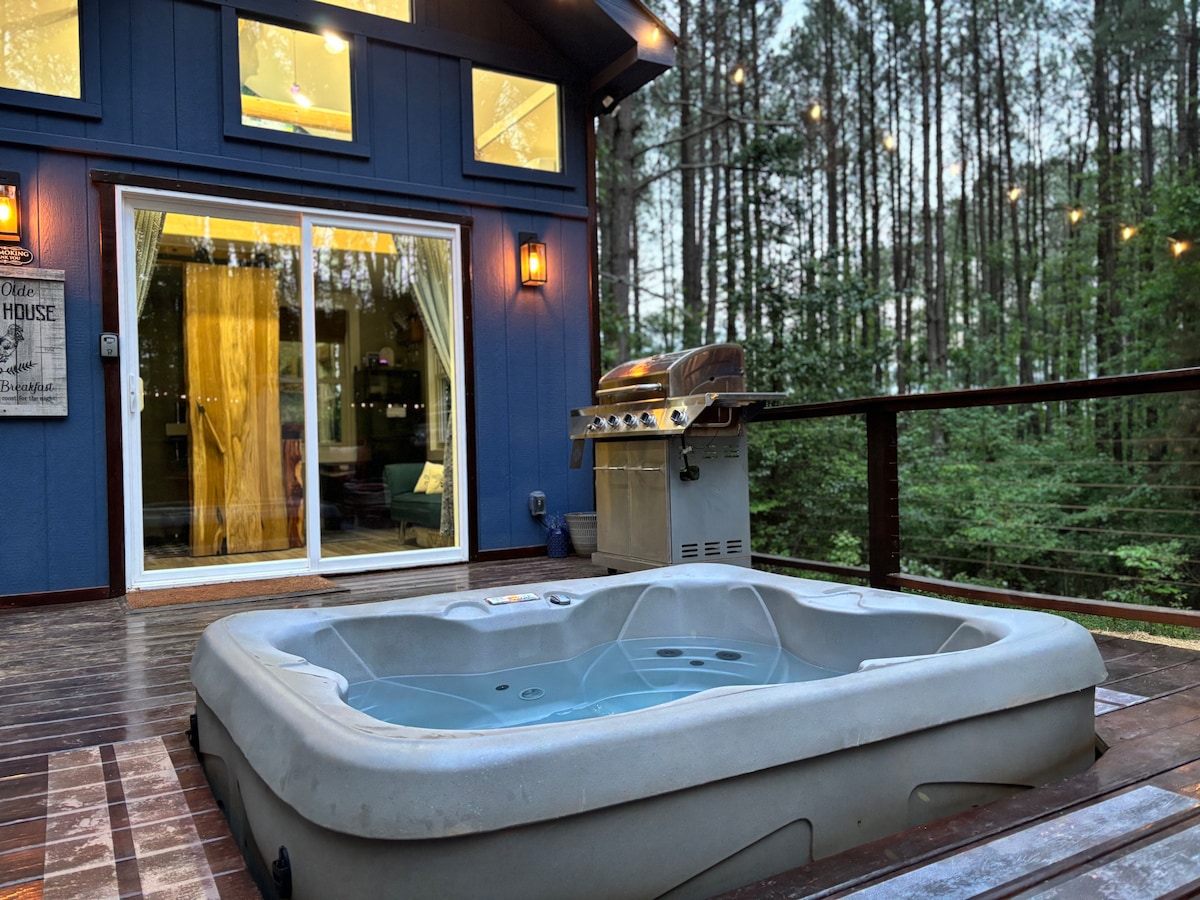 Welcome to your dreamy forest escape! This tiny cabin is all about cozy vibes, fresh air, and total relaxation. Sip coffee on the deck, chill in the hammocks, and soak up all the peace and quiet. You can unwind under the stars in your private hot tub, sit by the fire pit and let nature surround you. Stay connected with high-speed Internet and a flatscreen TV for your entertainment. Book your stay today and experience the charm and comfort of Tiny House living.