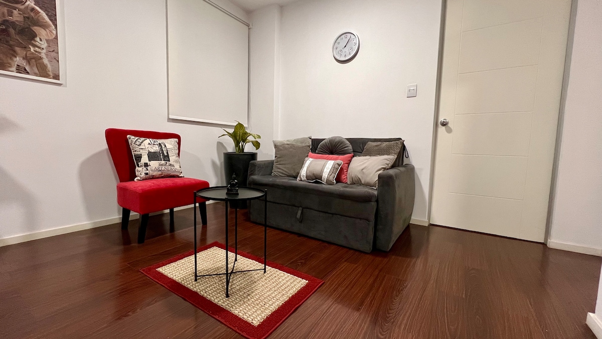 Bersantai di ruang yang selamat, tenang, selesa dan bebas daripada kebimbangan ini; di kawasan atas Cochabamba. Berseberangan taman yang indah untuk berjalan dan bersenam. Bangunan baru yang mempunyai bilik kerja dan WiFi yang mencukupi. Berhampiran kafe, Super Mercado, pusat membeli-belah dan restoran. Studio ini mempunyai ruang tamu, TV 65”, WiFi, katil sofa, katil Queen, bilik mandi yang selesa dan dapur yang dilengkapi dengan ketuhar gelombang mikro, ketuhar elektrik, pembuat kopi, dandang elektrik, peti sejuk dan aksesori.
