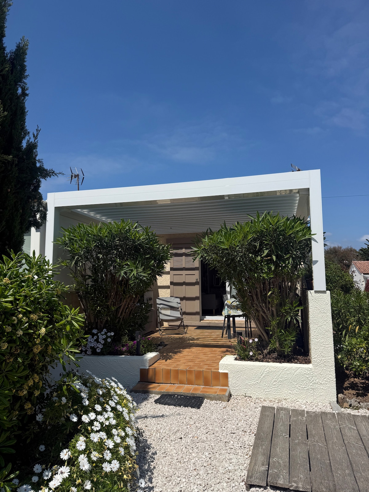 Selamat datang ke studio kami seluas 30m² yang diperbaharui sepenuhnya pada tahun 2024, yang terletak diPresqu 'île de Giens, di tingkat bawah dengan teres 16m ² Anda akan berada di kediaman yang selamat dan berpagar dengan ruang letak kereta persendirian. Anda akan mendapat akses ke pantai 200m berjalan kaki melalui laluan persendirian 300 meter ke kanan apabila meninggalkan kediaman ialah "Marché bergerie" dengan kedai roti, buah-buahan dan sayur-sayuran en primeur, penjual ikan, produk serantau dan teres yang menghadap Salins d 'Hyères lama🦩