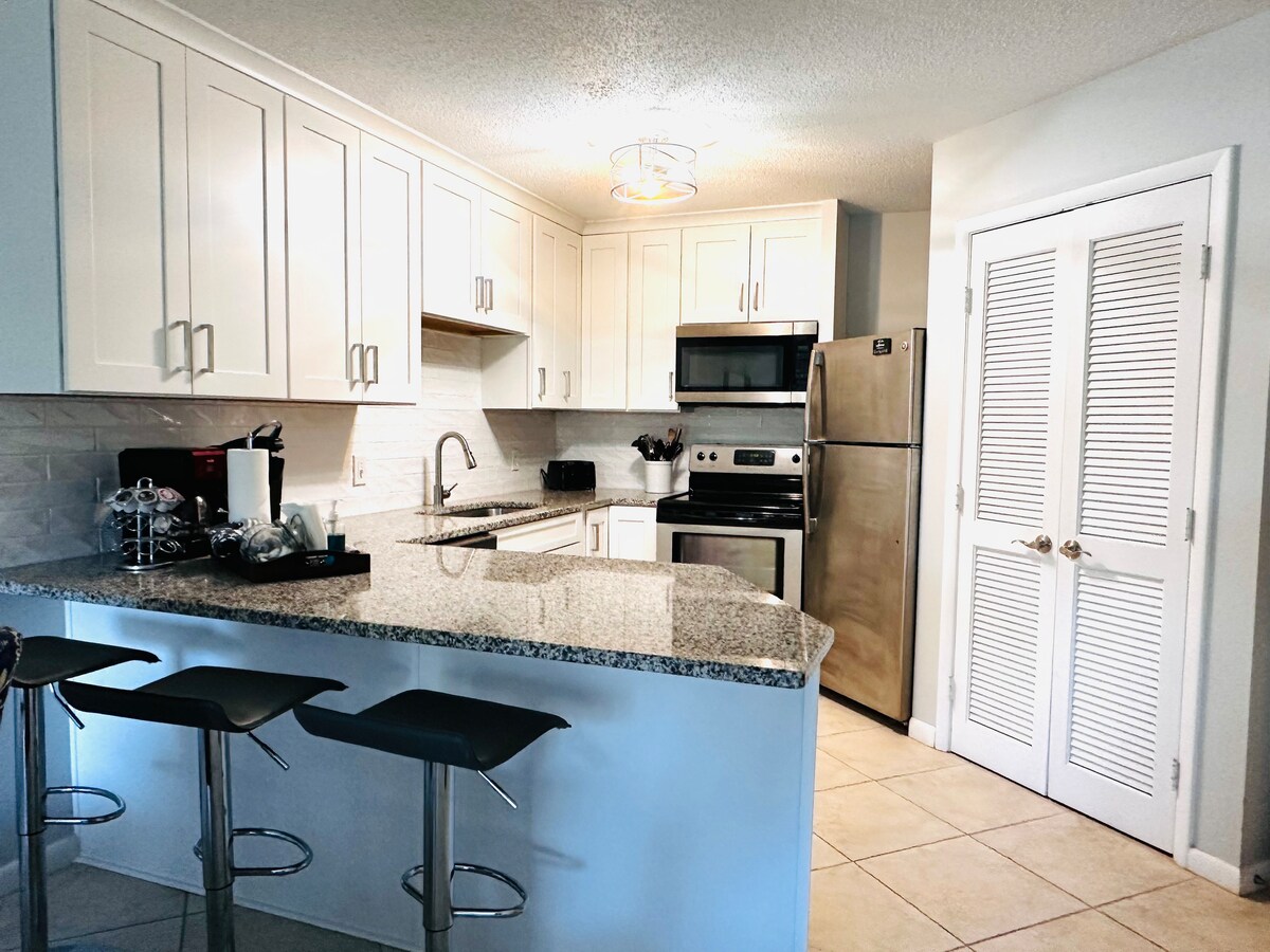 Baru diubahsuai, pemandangan laut 2 Bilik Tidur, 2 Bath beach villa. Berjalan kaki singkat ke pantai. Disaring di balkoni. Boleh memuatkan 6 orang, katil queen, katil double dan katil dua tingkat twin. Terletak di bangunan 1 yang paling dekat dengan pantai. Baru Diubahsuai pada Ogos 2020. Semua peralatan baru & TV pintar. Dapur & bilik mandi yang dikemas kini. Perabot & hiasan baru. Kemudahan Resort: Boardwalk ke Pantai Persendirian & pengangkutan ulang-alik bermusim Bar/Restoran 2 Kolam renang luaran &1 kolam renang dalaman yang dipanaskan Tab Mandi Panas & Bilik Kecergasan Sauna & Gelanggang Tenis Trek Larian Dalam Pintu