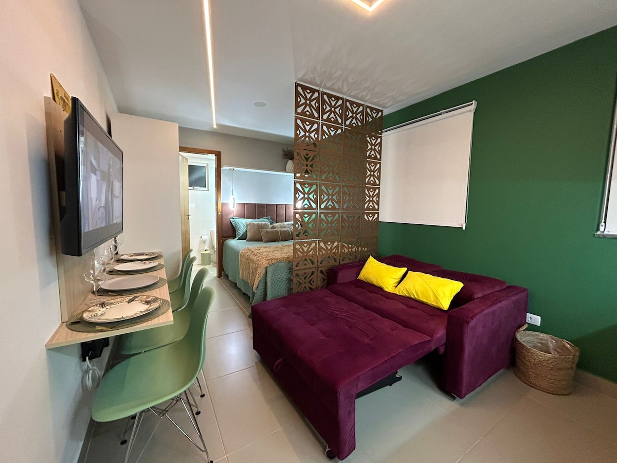Bersantai di ruang yang tenang dan bergaya ini. Studio baharu di Boa Vista. Berperabot lengkap dengan perabot yang dirancang dan keselesaan total untuk perjalanan perniagaan, konsert, pelancongan atau penginapan panjang anda di bandar Curitiba. Bangunan baharu dengan Concierge Jauh 24 jam (pengenalan wajah untuk masuk dan keluar), Gim, Bilik mesyuarat profesional, Coworking, Dobi Omo dan Teres dengan barbeku. Menginap, menyewa, atau tinggal di salah satu lokasi paling teknologi di Curitiba.