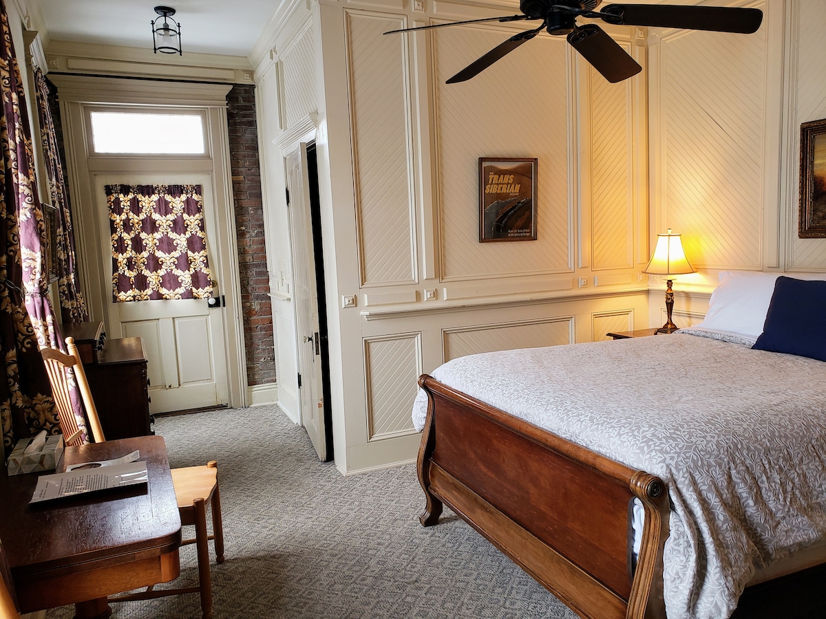 Experience the Inn’s history in the only room with its original 1930s layout. Featuring a queen bed, private bath, and balcony access, it’s perfect for relaxing with coffee overlooking Main Street — with our café just below.