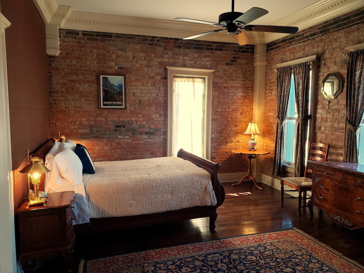 The Orient Express is room 1 at the Iron Horse Hotel in Blackwater, MO. It is on the second floor and looks out over Main Street in front of the building. The room has direct access to a shared rooftop deck which is perfect for coffee in the morning or drinks in the evening!