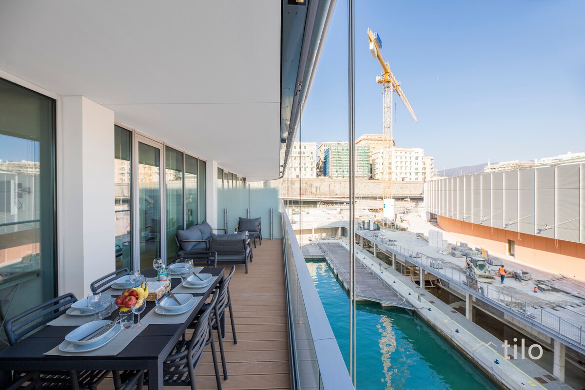 95 sm 2 bedroom flat with sea and city view on 17th floor (elevator) behind main square Piazza De Ferrari and 11 min. walk to aquarium. Living room with 2 sofa-beds and kitrchen with cooker, microwave, dishwasher, washing machine. 2 Bedrooms with queen size bed and large TV w Netflix.. Bathroom with shower - Free fast WiFi - Secured Underground Parking next door 22 Euro/day. Supermarket downstairs. CITRA: 010025-LT-1771