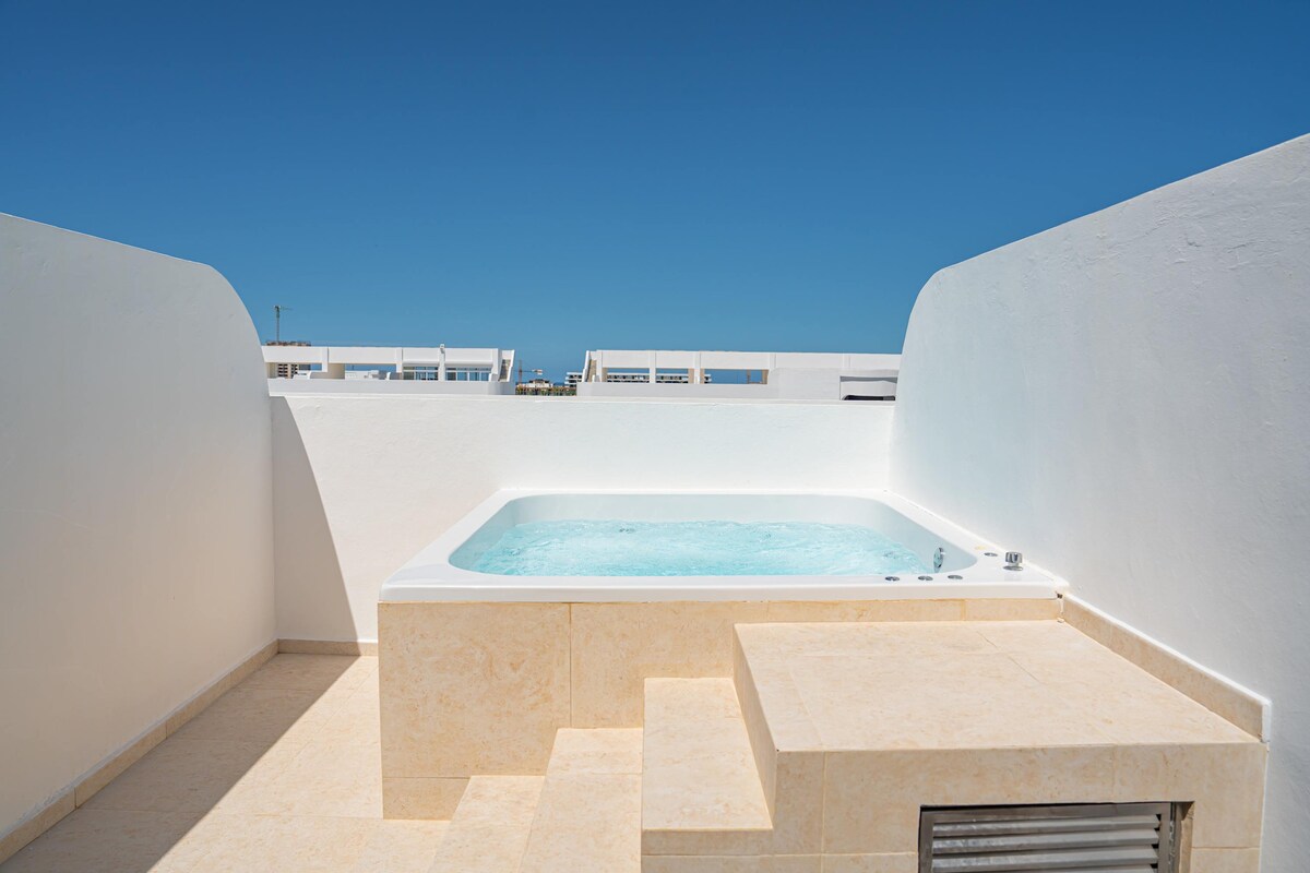 Pool Penthouse “Skyview” – Top Central Location This Pool Penthouse offers ocean and mountain views with beautiful sunrises and sunsets, plus refreshing ocean breezes. The penthouse is truly special. Just steps from the famous WHITE BEACH with iconic beach bars. The private ROOFTOP PICUZZI makes this a magical retreat. Village Los Corales is the Airbnb hotspot, surrounded by restaurants, bars, live music, DJs, shops, supermarkets, pharmacies, and everything needed for a perfect vacation.