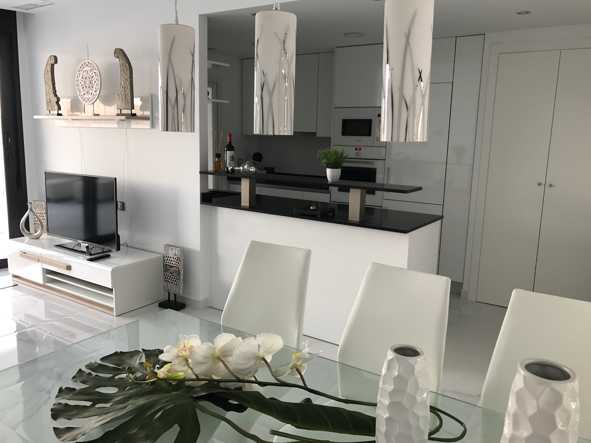 Apartmen baru yang bergaya dan terang terletak di baris pertama laut pantai Del Cura, ia mempunyai semua yang anda perlukan untuk percutian dan keluarga! Kedai-kedai Mercadona, pelbagai pakaian, kasut, cenderamata, wain, keju, banyak penerbangan, kafe, restoran, taman hiburan dan tarikan kanak-kanak, stesen bot dan banyak lagi dalam jarak berjalan kaki!