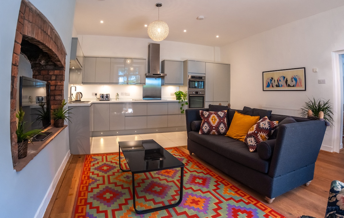 Apartmen yang bergaya, baru diubahsuai dan selesa di lokasi terbaik di Bristol, dengan taman persendirian yang besar. Dapur khusus tinggi baharu, pemanasan bawah lantai, bidai hitam elektrik pintar, wifi kelajuan tinggi, TV pintar 4K dan katil raja yang sangat selesa. Taman yang baru ditanam dan lanskap untuk anda sendiri. Tempat letak kereta percuma di luar dan segala yang anda perlukan dalam jarak berjalan kaki, termasuk berpuluh-puluh restoran dan bar, muzik langsung dan tiga pawagam.