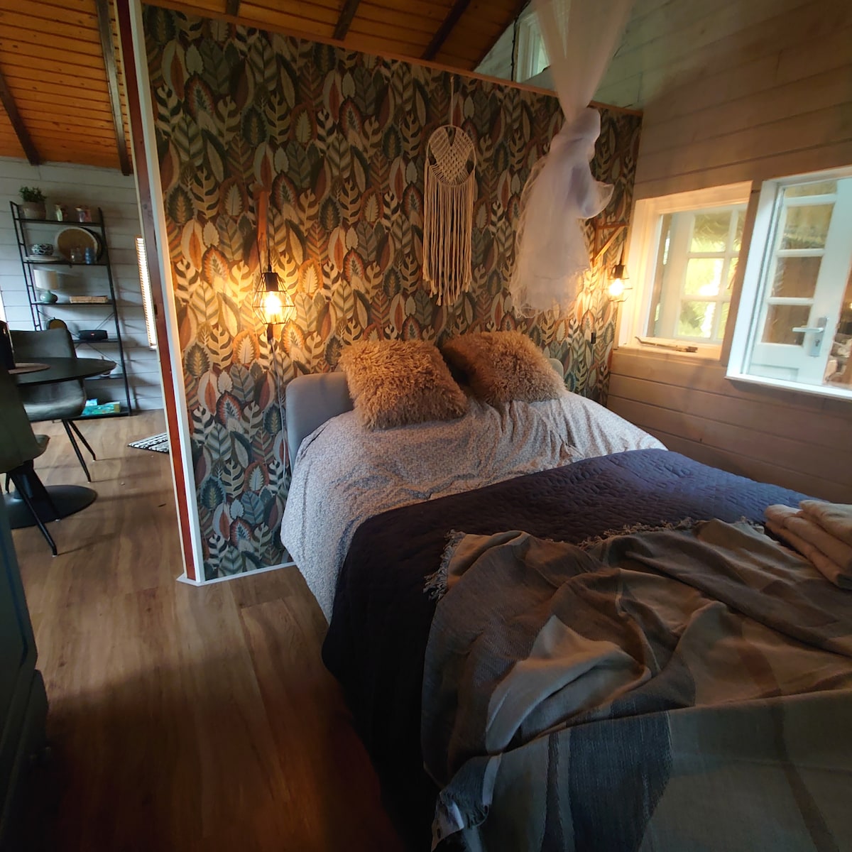 De kampeerbungalow is een eenvoudig ingerichte overnachtingsplek voor maximaal 4 personen en bevat een tweepersoonsbed (2 matrassen van 80 cm), een eenpersoonsbed en er is een extra bed in het woonvertrek te plaatsen. De slaapvertrekken zijn door middel van een houten tussenwand van elkaar gescheiden. De bungalow is gemaakt van hout en heeft een dak gemaakt van dik (vrachtwagen) zeil zodat u ook tijdens de wat vochtigere dagen heerlijk droog in deze accommodatie kunt verblijven.