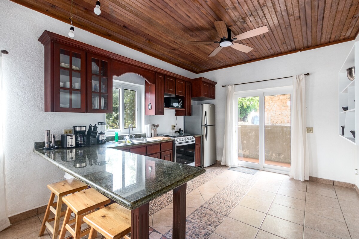 Apartmen satu bilik tidur yang selesa di TINGKAT satu ini terletak dalam jarak berjalan kaki singkat ke Half Moon Bay Beach dan pusat kampung West End. Kedai menyelam, barangan runcit Woody, Sundowners dan restoran semuanya dalam jarak berjalan kaki. Pembinaan yang lebih baru dengan kaunter granit, peralatan gas, tv skrin rata 32 inci, katil saiz queen, mesin basuh dan pengering, dapur penuh dan patio sesuai untuk percutian yang santai, perjalanan menyelam skuba, dan tempat tinggal semasa melawat.