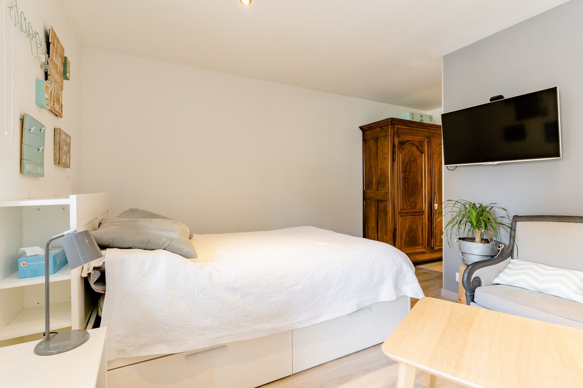 Datang dan temui studio "CHEZ MARIETTE": penginapan unik seluas 25m2 ini antara TASIK dan GUNUNG, di rumah ladang yang diubahsuai sepenuhnya, tenang dan terletak sempurna 30 menit dari sempadan SWITZERLAND. TEMPAT LETAK KENDERAAN 🚗 PERCUMA di premis Kapasiti 🧑🧑🧒🧒 penghunian: 2 pers. 📍Lokasi: Di bandar yang tenang berhampiran Switzerland, di tengah-tengah Haute Savoie ✈️ Akses lapangan terbang: 35 minit dengan kereta ⛰️ Tasik dan resort dalam masa satu jam dengan kereta Annecy dalam masa 30 minit