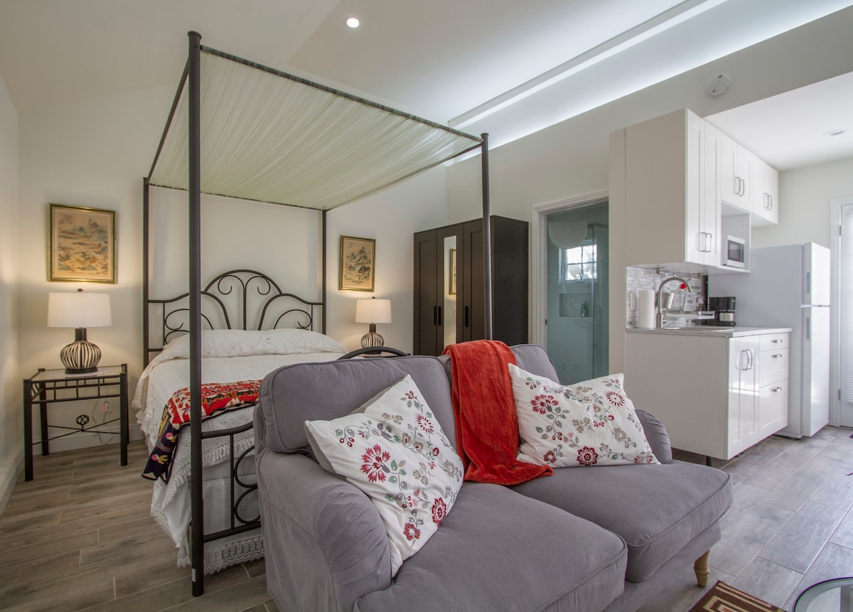 Selamat datang ke casita taman persendirian anda! Nikmati tilam busa memori queen, katil sofa, penyaman udara, Wi-Fi berkelajuan tinggi, dan Apple TV. Ruang ini menampilkan pancuran hujan bergaya dan dapur dengan bahagian atas dapur dan gril (tiada ketuhar). Keluar ke patio terpencil anda dengan perabot luar dan lubang api-sempurna untuk malam yang selesa. Selain itu, tempat letak kereta percuma di tepi jalan menambah kemudahan. Terletak hanya 10 minit dari Santa Monica, Venice, West Hollywood, dan Downtown. Alami Pantai Barat dengan bergaya!