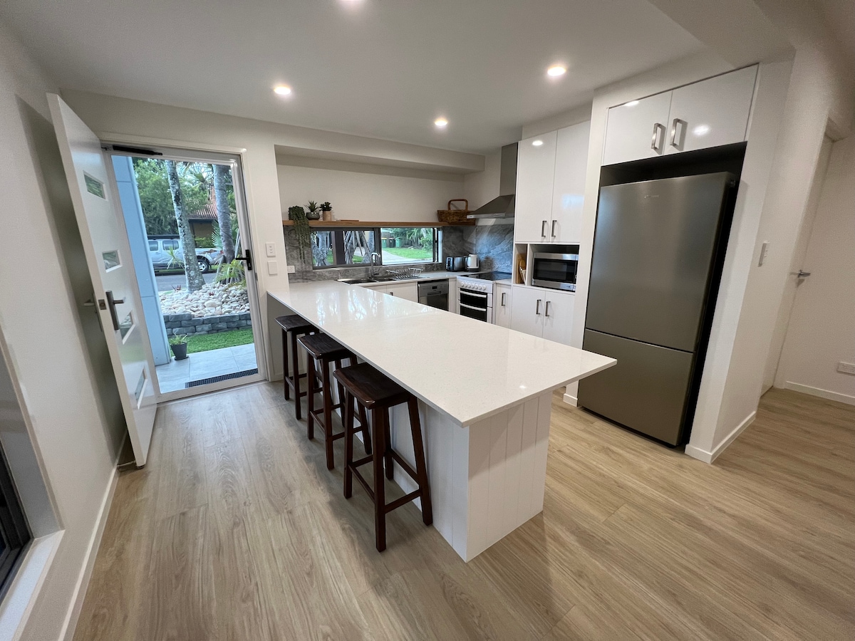 Relax in our spacious downstairs guest suite, perfect for singles, couples or a family (2 adults, 2 kids) wanting a beachside break without the hustle & bustle. Easy 5 min walk to beautiful Wurtulla beach, parks, playgrounds, beachside walking/bike path. 6 min drive to Sunshine Coast Uni Hospital or Lake Currimundi, shops & restaurants. Make yourself at home in a modern kitchen, dining, large bathroom, lounge, separate bedroom (queen) + exclusive use of back patio & BBQ.