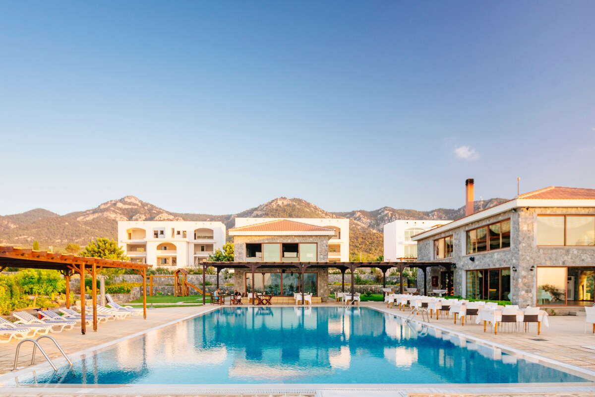 Apartmen dupleks taman dua bilik tidur yang menakjubkan ini terletak di kaki bukit yang subur di Five Finger Mountain Range di rantau Esentepe/Girne di utara Cyprus. Kolam renang di lokasi, padang golf hanya beberapa minit memandu. Sesuai untuk keluarga.