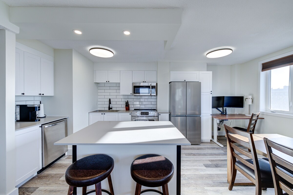 Suite Eksekutif Cantik di Tengah-tengah Saskatoon. Tiada senarai kerja daftar keluar. Separuh blok dari denai sungai. Jarak berjalan kaki dari pusat bandar, University of Saskatchewan, Sask Polytechnic, City Hospital, Royal University Hospital, Children 's Hospital, Remai Modern Gallery, Nutrien Wonderhub, dll. Sesuai untuk pasangan atau pengembara solo; perniagaan, akademik, perubatan, atau sekadar menjadi pelancong! Pintu masuk tanpa kunci - tidak boleh membawa kunci di sekitar sini. Penuh dengan seni asal.