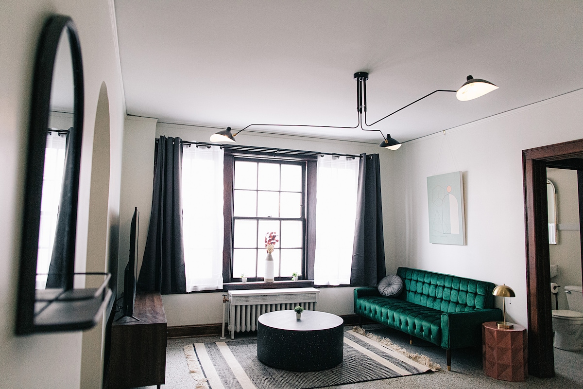 Located within The Wilson, this thoughtfully designed second-floor corner studio sits at the back of the building for a quiet, tucked-away feel. Historic charm meets refined comfort, and a dedicated vanity offers a convenient space for getting ready. Guests enjoy access to the shared rooftop deck overlooking nearby restaurants and nightlife. Hosted by a local husband-and-wife team passionate about thoughtfully curated spaces. Second-floor walk-up and paid parking nearby.