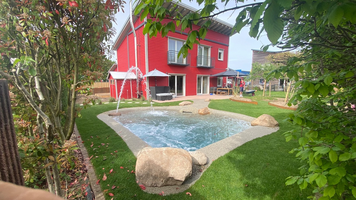 Apartmen bawah tanah kami yang dilengkapi dengan perabot yang menarik boleh menempatkan dua orang. Anda boleh menjangkakan bilik tidur besar dengan katil spring kotak, bilik mandi moden dan dapur yang serba lengkap. Apabila cuaca baik, anda boleh berehat di luar di teres. Apartmen ini terletak di ruang bawah tanah rumah keluarga tunggal kami yang didiami. Kami tinggal di sini sebagai sebuah keluarga dengan anak-anak. Dalam masa hanya 5 minit anda berada di alam semula jadi – sesuai untuk berjalan-jalan, walaupun dengan anjing. Tidak sabar untuk berjumpa anda tidak lama lagi!