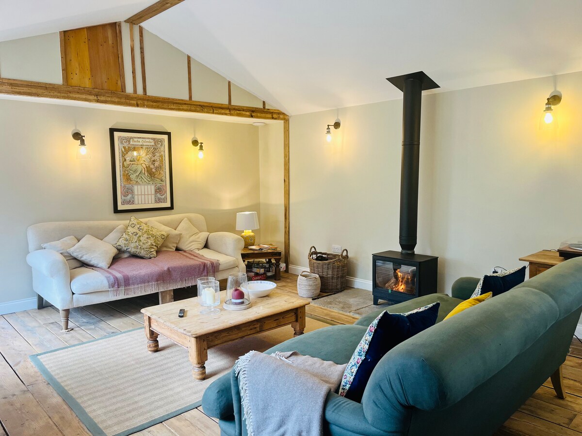 Cosy rural barn with woodburner and hot tub.