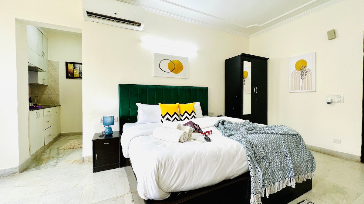Apartmen 1BHK yang ➽ luas dengan patio bersambung, berhawa dingin sepenuhnya. Semua bilik mempunyai penyaman udara 1.5 tan. ➽ Penginapan menghadap matahari di kejiranan berpendapatan tinggi, tiga sisi terbuka, menghadap taman, dan mempunyai pengudaraan yang baik dengan cahaya semula jadi yang mencukupi dan udara segar. Projektor ➽ mewah dengan bar bunyi 25W dan Amazon FireStick dengan aplikasi OTT. ➽ Dapur yang serba lengkap dengan keperluan asas untuk memasak dengan mudah. ➽ Bersantai di patio teres persendirian yang menakjubkan dengan lampu persekitaran dan sistem Foger yang unik untuk menyejukkan patio