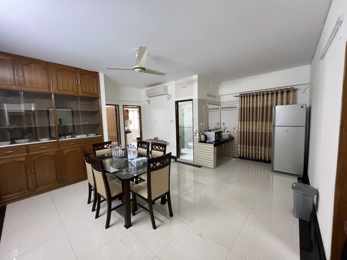 Apartmen yang luas dan berperabot lengkap ini sesuai untuk pengembara perniagaan, individu, kumpulan dan keluarga. Apartmen tingkat 7 mempunyai 4 balkoni, pemandangan yang tidak terhalang, pelan lantai terbuka dan kemudahan moden. 20 minit dari Lapangan Terbang Antarabangsa Dhaka, Banani adalah kawasan mewah, selamat dan kebanyakannya kediaman dengan akses kepada restoran tempatan, taman & pasar. WIFI Berkelajuan Tinggi, Pejabat, Atas bumbung, Gimnasium, Garaj, Dapur Lengkap, A/C, Chef/ Pembantu rumah atas permintaan, Penjana, Kafe 24/7 berdekatan