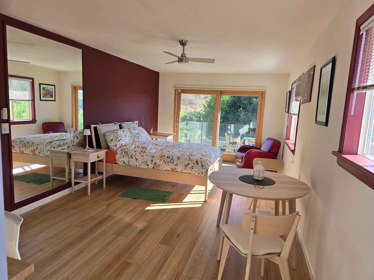 Former Plus-rated Studio. How about a rejuvenating get-away with pool and hot tub? Picture window overlooking a garden. Sunbathe poolside. Watch TV from a comfy bed before falling into a restful sleep. 27 stairs to house, 3 stairs inside unit. Complimentary beverage for 3+ nights/return stay. After 10 stays, $100 credit. Deep cleaned. 2 separate units off same foyer; no shared walls. Private locked unit door. Shared access to spa/pool (9am-11pm) for overnight guests only. Host lives upstairs.