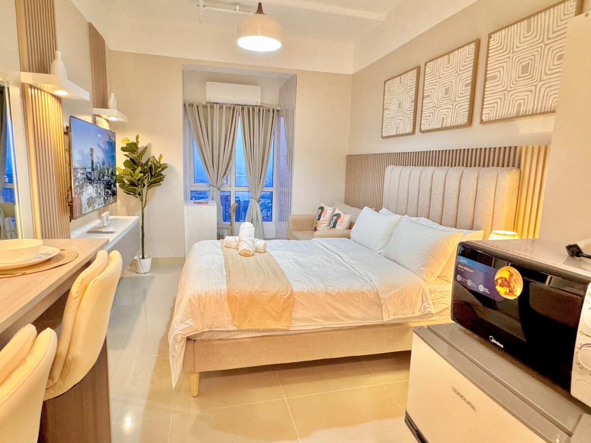Selamat datang ke unit studio yang selesa ini di Quezon City, percutian sempurna anda! Ruang ini menampilkan katil bersaiz double yang selesa, TV pintar 55 inci dengan Netflix, Disney+, dan HBO Go, dipadankan dengan sofa malas, dapur kecil yang kompak namun serba lengkap, dan ruang tamu bergaya yang sesuai untuk bersantai selepas seharian meneroka. Dengan kafe, restoran, dan tarikan yang hanya beberapa langkah jauhnya, sama ada anda berada di sini untuk urusan perniagaan atau percutian, studio ini menjanjikan penginapan yang menyeronokkan di tengah-tengah bandar.