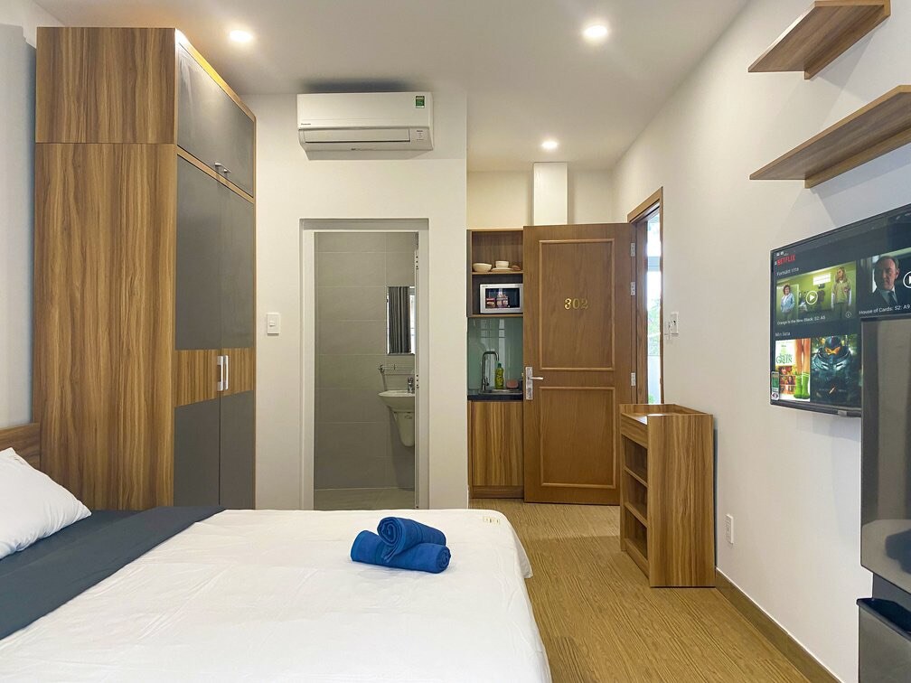 Apartmen studio yang direka dengan indah dengan semua yang anda perlukan, terletak di tengah-tengah tetapi tersembunyi hanya cukup untuk tidur malam yang tenang jauh daripada bunyi bising bandar yang padat. Sesuai untuk pengembara yang ingin meneroka Saigon dan mencari keselesaan berkualiti dan pengalaman yang lebih tempatan. - Kolam renang yang cantik - Wifi pantas percuma, TV kabel - Kemudahan percuma untuk ruang tamu anda: mesin basuh, pengering, AC, peti sejuk, air panas - Dapur dengan alat yang mencukupi untuk memasak anda. Perhatian: Tidak menyediakan/menyokong invois VAT