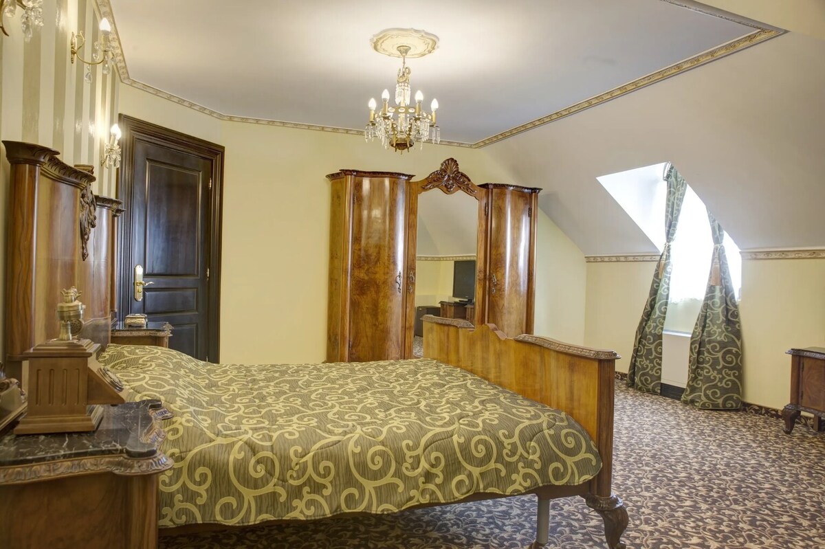 Camera 9 DUBLA DE LUXE cu baie proprie, dotata baie propri cu cada este situată la mansarda este cea mai spatioasa camera din hotel. Cu un pat mare, spațios, pe mijloc, decorată în stil old-time, cu bun-gust, spațioasă, încăperea vă va introduceîntr-o epocă plină de mister. Suplimentar are adaugata si o canapea extensibila. Baie spatioasa cu cada Camerele sunt dotate cu : -Mobilier Ludovic -Masa si scaune -Masa de toaleta -TV -Mini-Bar -Articole de baie -Papuci, halat si prosoape
