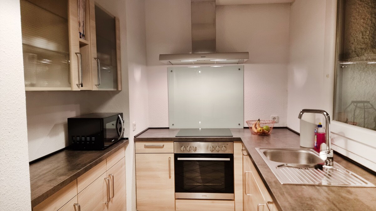 Kami menyewa apartmen berperabot moden kami dengan ruang tamu seluas 40m². Kami memberi perhatian khusus kepada kebersihan dan disinfeksi selepas setiap tetamu! Tingkat bawah - 1.5 bilik dengan dapur kecil, bilik mandi dan pintu masuk berasingan. Apartmen ini dilengkapi dengan katil bujang 120 cm x 200 cm di bilik tidur dan sofa lipat moden termasuk penutup tilam yang selesa kira-kira 120 cm x 190 cm. Bantal, selimut, cadar dan tuala, peti sejuk dengan peti sejuk beku, pinggan mangkuk, pembakar roti, mesin kopi Senseo,