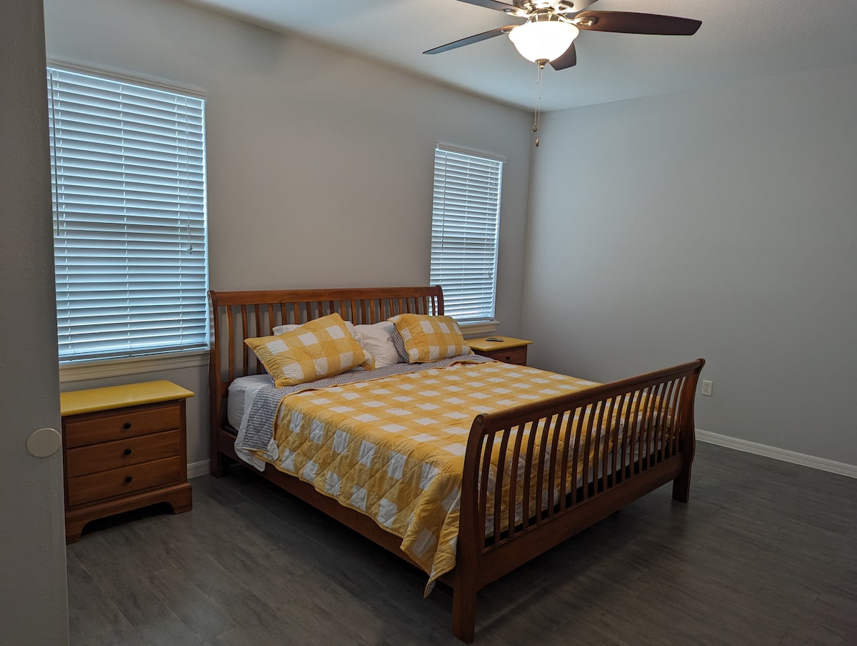 Ruang untuk 2 orang. Studio persendirian, pintu masuk persendirian, tempat letak kereta di hadapan. Dilarang merokok di studio. Pancuran mandi peribadi yang besar dengan pelembut, kepala yang boleh ditanggalkan, Katil KING, tv warna, kabel ,wifi. Meja yang cukup besar untuk digunakan untuk perniagaan, ketuhar gelombang mikro, mesin pembuat kopi, pembakar roti, peti sejuk, almari laci, peti dengan simpanan gantung dan cadar yang disediakan. Terdapat ruang duduk di luar untuk merokok dan berehat. Unit AC/Pemanas yang ditambah dipasang bersama-sama dengan unit sistem pusat standard rumah utama kami untuk keselesaan tambahan yang dikawal oleh anda