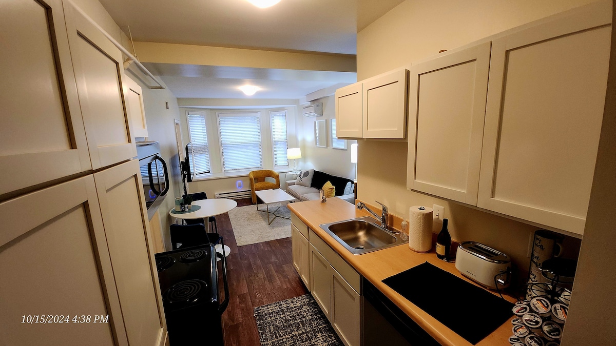 Satu apartmen bilik tidur berperabot cantik terletak di lokasi yang ideal. TERMASUK TEMPAT LETAK KERETA! (Satu kenderaan.) Sesuai untuk penginapan jangka panjang atau jangka pendek. Sama ada anda menginap beberapa hari, beberapa minggu, atau bulan demi bulan, di sinilah anda mahu berada! Apartmen ini terletak di tengah pusat bandar. Anda dalam jarak berjalan kaki ke banyak restoran, bar, tempat konsert, dan acara sukan yang hebat. KAMI BOLEH MEMUATKAN PENGEMBARA PERNIAGAAN YANG MEMERLUKAN PENGINAPAN YANG LEBIH PANJANG.