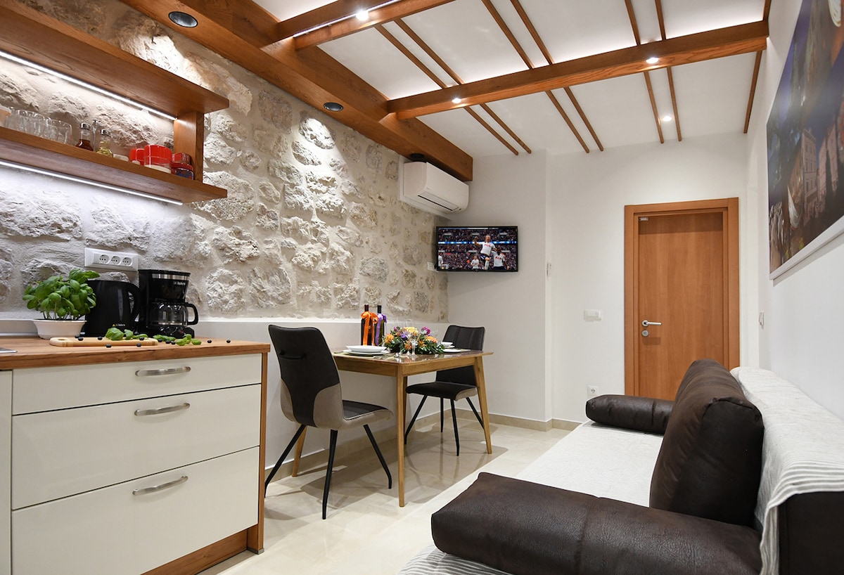Apartmen batu moden di tingkat bawah dan dipasang sepenuhnya untuk 2 orang, terletak di tengah-tengah Bandar Lama Dubrovnik dan termasuk satu bilik tidur dengan katil kelamin, bilik mandi, ruang tamu, dapur kecil yang serba lengkap, AC, Wifi, TV, mesin basuh, seterika, linen dan tuala bersih, tingkap kalis bunyi, jarak dekat dengan perhentian bas, kedai roti, bar, restoran, dan pantai. Daftar masuk sendiri dengan kotak kunci, atau daftar masuk dengan bantuan hos atas permintaan. Layari cadangan kami tentang tempat yang boleh dikunjungi