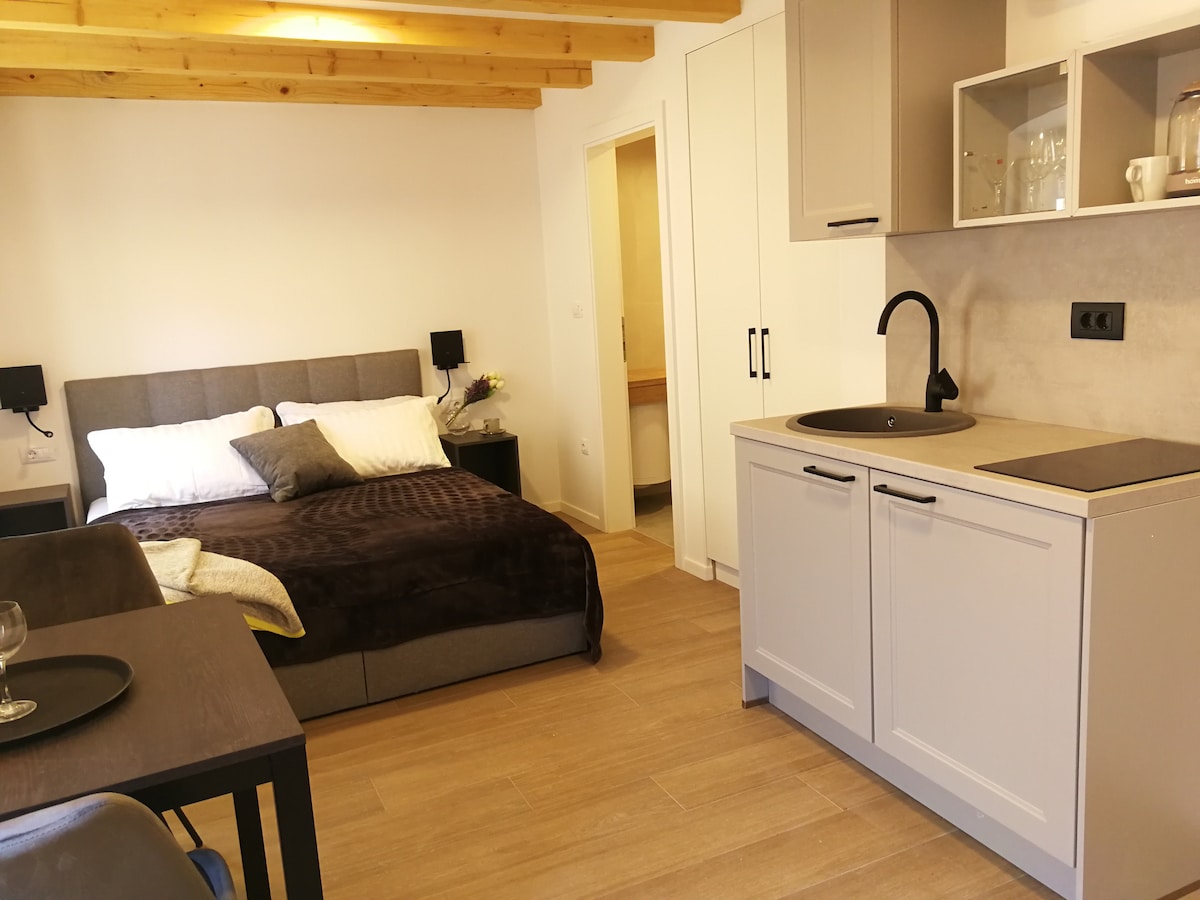 Apartmen tingkat 1 moden yang sesuai untuk 3 orang dan terletak di tengah-tengah Bandar Lama Dubrovnik, dan termasuk satu bilik tidur dengan katil kelamin, dapur kecil lengkap, bilik mandi, ruang tamu dengan katil sofa, pendingin hawa, WiFi, TV, mesin basuh, tingkap kalis bunyi, cadar dan tuala bersih, perhentian bas 2 minit berjalan kaki, jarak dekat ke kedai roti, bar, restoran, pantai. Daftar masuk sendiri dengan kotak kunci, atau daftar masuk dengan bantuan hos atas permintaan. Layari cadangan kami tentang tempat yang boleh dikunjungi