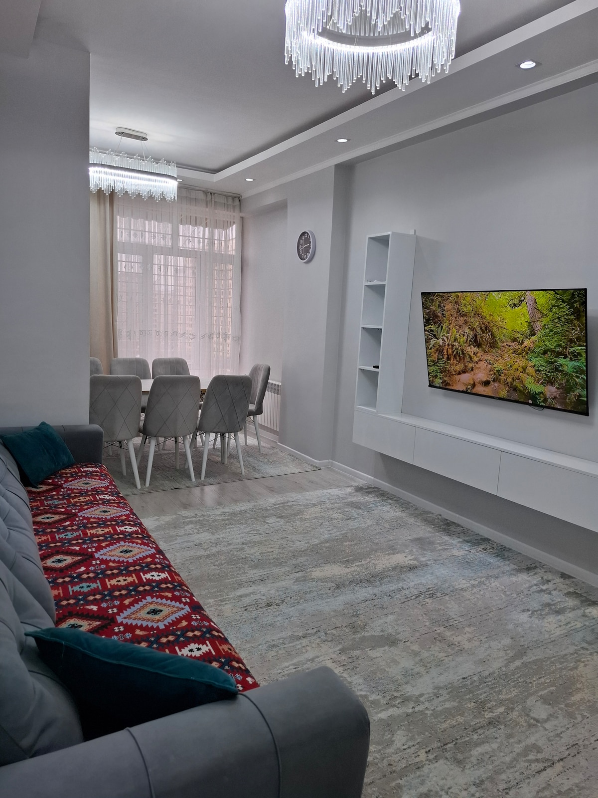 Apartmen baru di pusat bandar Dushanbe. Bilik tidur dan ruang tamu yang selesa dan bergaya dengan warna neutral yang akan menjadikan penginapan anda selesa. Pemandangan bandar yang menakjubkan. Dapur baru yang berfungsi sepenuhnya. Banyak kedai dan restoran dalam jarak yang dekat. 5 minit berjalan kaki ke Rsesy Avenue.