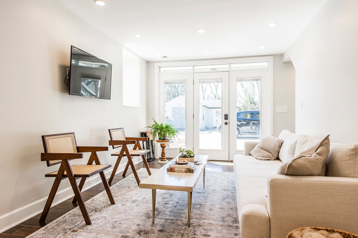 Apartmen tingkat bawah yang selesa dengan katil queen, bilik mandi, pendiangan, tv pintar, meja & tempat letak kereta percuma di tepi jalan. Sofa bersaiz apartmen (bukan tempat tidur). Dikelilingi oleh restoran kegemaran E. Nashville. Lyft/Uber singkat ke pusat bandar, taman, lapangan terbang. Laluan pejalan kaki mempunyai 6+ anak tangga dengan susur tangan. Dua langkah ke dalam apartmen. Perhatian: Daftar masuk awal atau lewat dikenakan yuran $15. Jika diminta, yuran akan dikenakan dan kami akan menukar jadual pembersihan.