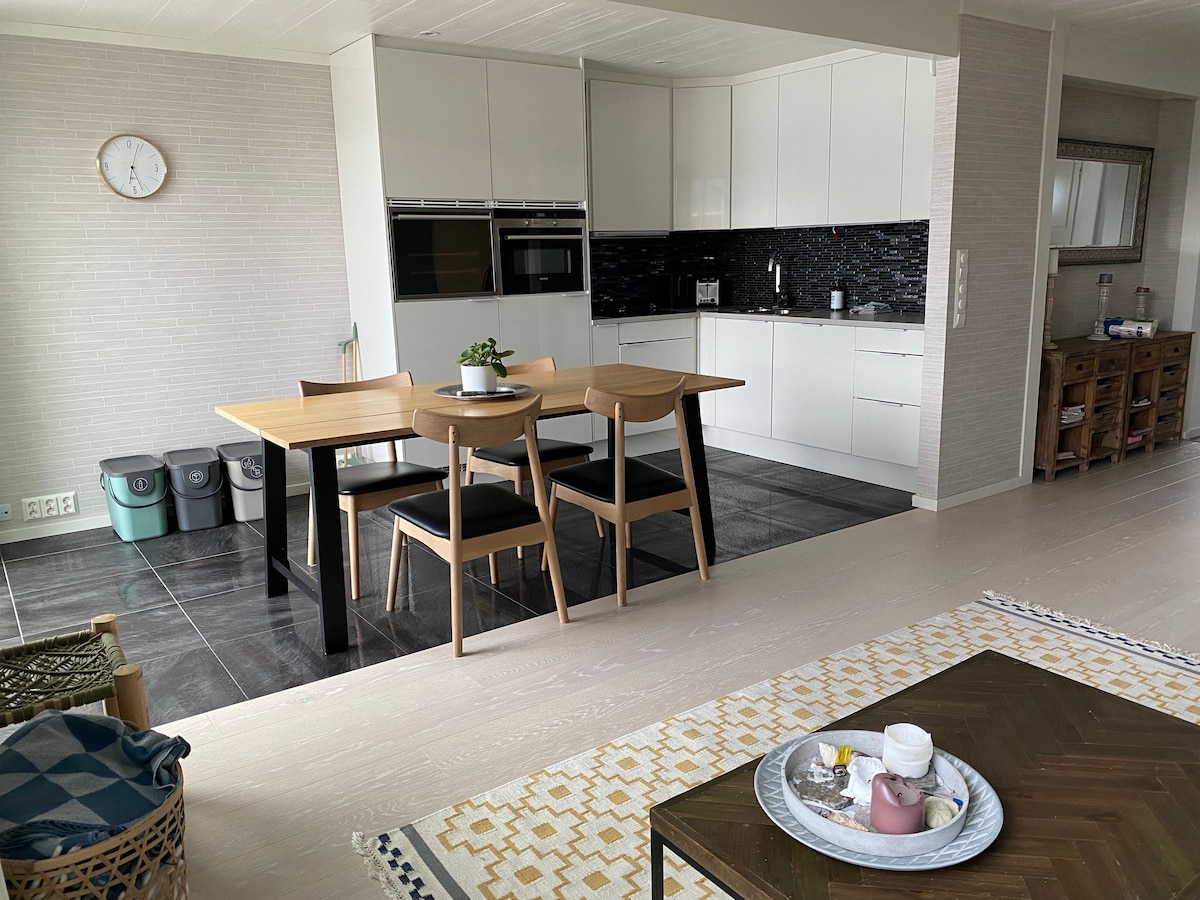 Enjoy your stay in Lofoten in a fishermans cabin with everything you need. The cabin is new, modern, and lays right by the ocean and mountains. The cabin is equipped with everything you need, with a large, fully equipped kitchen, four bedrooms, a living room with a beautiful view, 1,5 bathrooms with shower and washing machine, and a dining room with room for the whole family. Nice fireplace in the livingroom on the second floor.