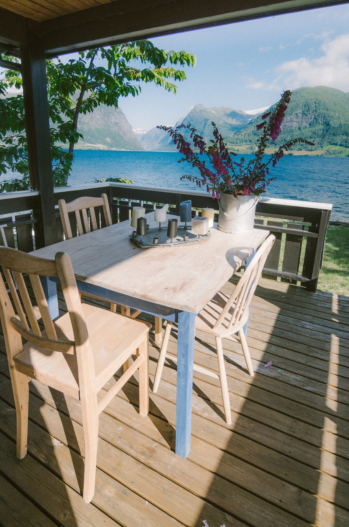 Kotej musim panas Idyllic di tepi air di Jølster