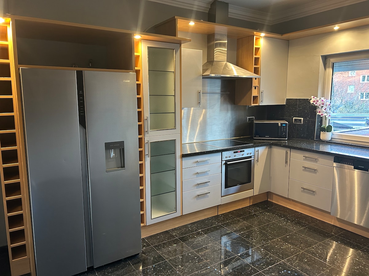 Zentral und dennoch sehr ruhig gelegene Luxus Unterkunft mit 2 Parkplätzen. 10 Min. vom Flughafen und 20 Min. von Hauptbahnhof entfernt. Auf 180qm Wohnfläche verteilt auf Wohn- und Esszimmer mit Kamin, drei Schlafzimmer und zwei Bäder. Die Unterkunft hat ein masterbedroom mit einem angrenzenden Dreibettzimmer und eigenen Ensuitebad. Ein zweites großes Schlafzimmer mit einem eigenen Bad steht unseren Gästen zur Verfügung. Eine Leseecke mit einem gemütlichen Schlafsofa rundet das Angebot ab.