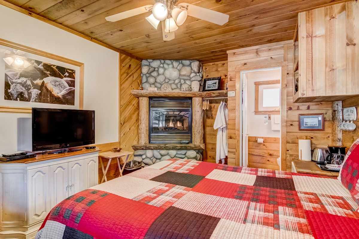 Selamat datang ke bilik gaya log-cabin kami yang selesa. Suite individu ini menawarkan katil Queen, pendiangan gas unik, bilik mandi peribadi, TV Pintar, kipas siling, pembuat kopi, pembakar roti, microwave dan peti sejuk mini. Perhatian: Ini adalah salah satu daripada hanya 5 bilik mesra anjing - caj tambahan dikenakan sebanyak $ 35 bagi setiap haiwan peliharaan/malam dan akan dikutip semasa daftar masuk. Cukai Bandar 12% & Cukai Bilik $ 3.00 semalam, akan dikutip daripada anda semasa daftar masuk. Tiada A/C