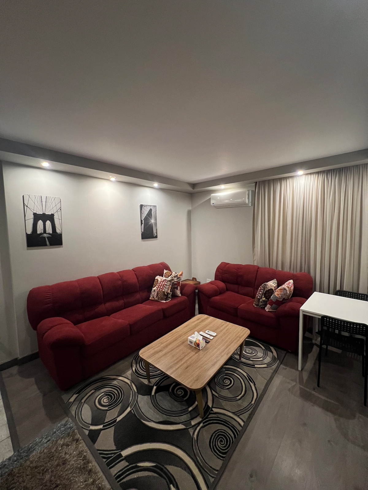 Selamat datang ke kediaman anda, sesuai untuk penginapan jangka pendek dan panjang. Apartmen 2 bilik tidur kami yang luas hanya 5 minit dari Lapangan Terbang Kaherah. Bilik tidur utama menampilkan katil bersaiz king dan katil bayi untuk anak-anak kecil anda (umur 0-8 tahun). Bilik tidur kedua mempunyai dua katil sederhana. TV 50 inci (termasuk Netflix) dapur serba lengkap mempunyai semua yang anda perlukan, daripada dapur gas hingga ketuhar gelombang mikro dan cerek. Bersantai di balkoni dengan pemandangan pokok yang indah, atau bersiar-siar hanya seminit ke pasar raya tempatan, kedai roti, dan banyak lagi.