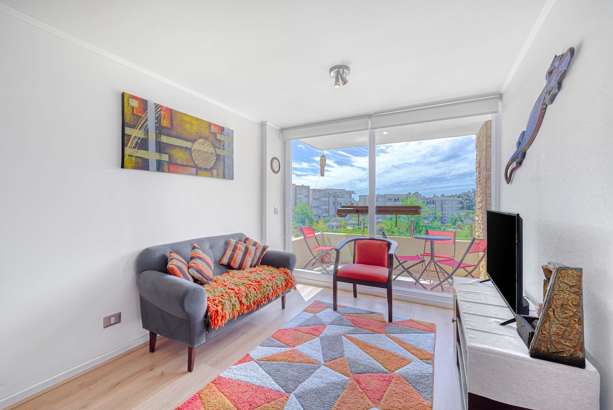 Escápate de la rutina a menos de dos horas de Santiago. Increíble departamento con dormitorio principal cama King con baño en suite y dormitorio 2 con camarote y cama individual, con baño en pasillo, con sábanas y toallas, cuenta con gran vista, wifi, tv en dormitorio y living, parrilla a gas, Calefaccion, amoblado full para disfrutar junto a los tuyos!! Estacionamiento. A pocos minutos de la playa, cafés y restaurantes, cuenta con piscina, quedamos atentos a tus duda!!