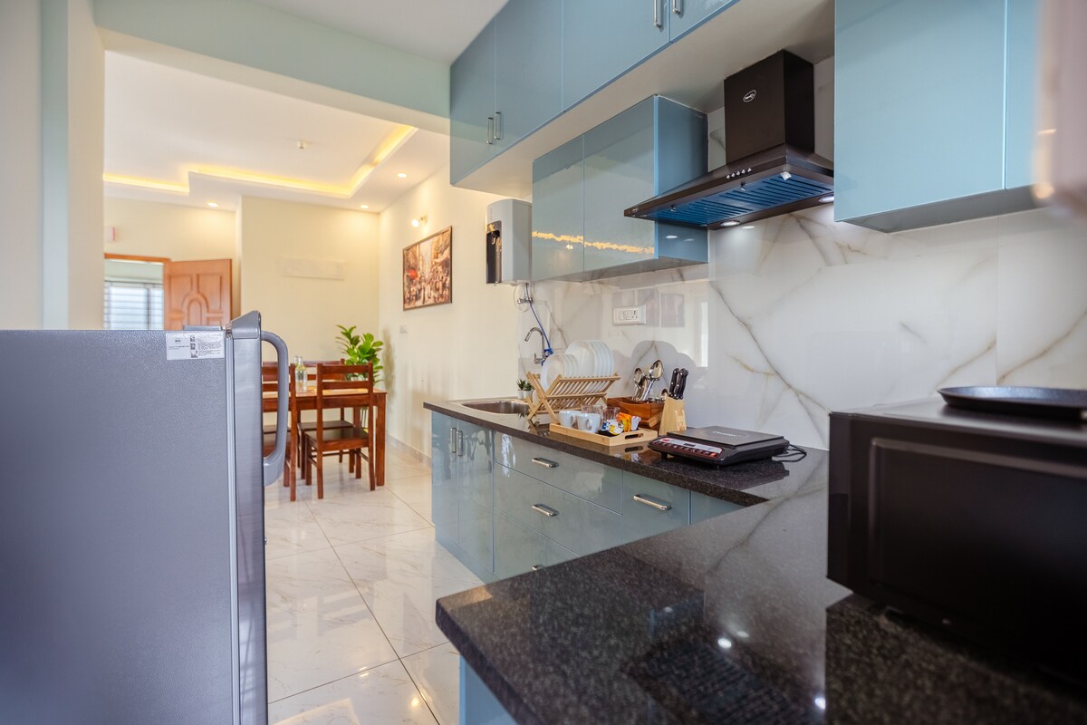 Suite 1BHK Pereka 600 kaki persegi yang luas dengan Balkoni Persendirian | Wi-Fi gentian optik berkelajuan tinggi & TV Pintar dengan platform penstriman, Meja Kerja/Makan, sandaran kuasa 24/7 untuk kerja dan keselesaan tanpa gangguan | Katil King & Tilam Ortopedik Luxe, almari pakaian kayu untuk simpanan | Dapur Kecil yang serba lengkap | Katil Sofa di ruang tamu , Max.Occupancy 4 | Akses lif, pengemasan profesional dan akses kepada dobi berbayar di tapak untuk penginapan jangka panjang | Terletak di Bangalore Tengah | LGBTQIA++ Affirmative