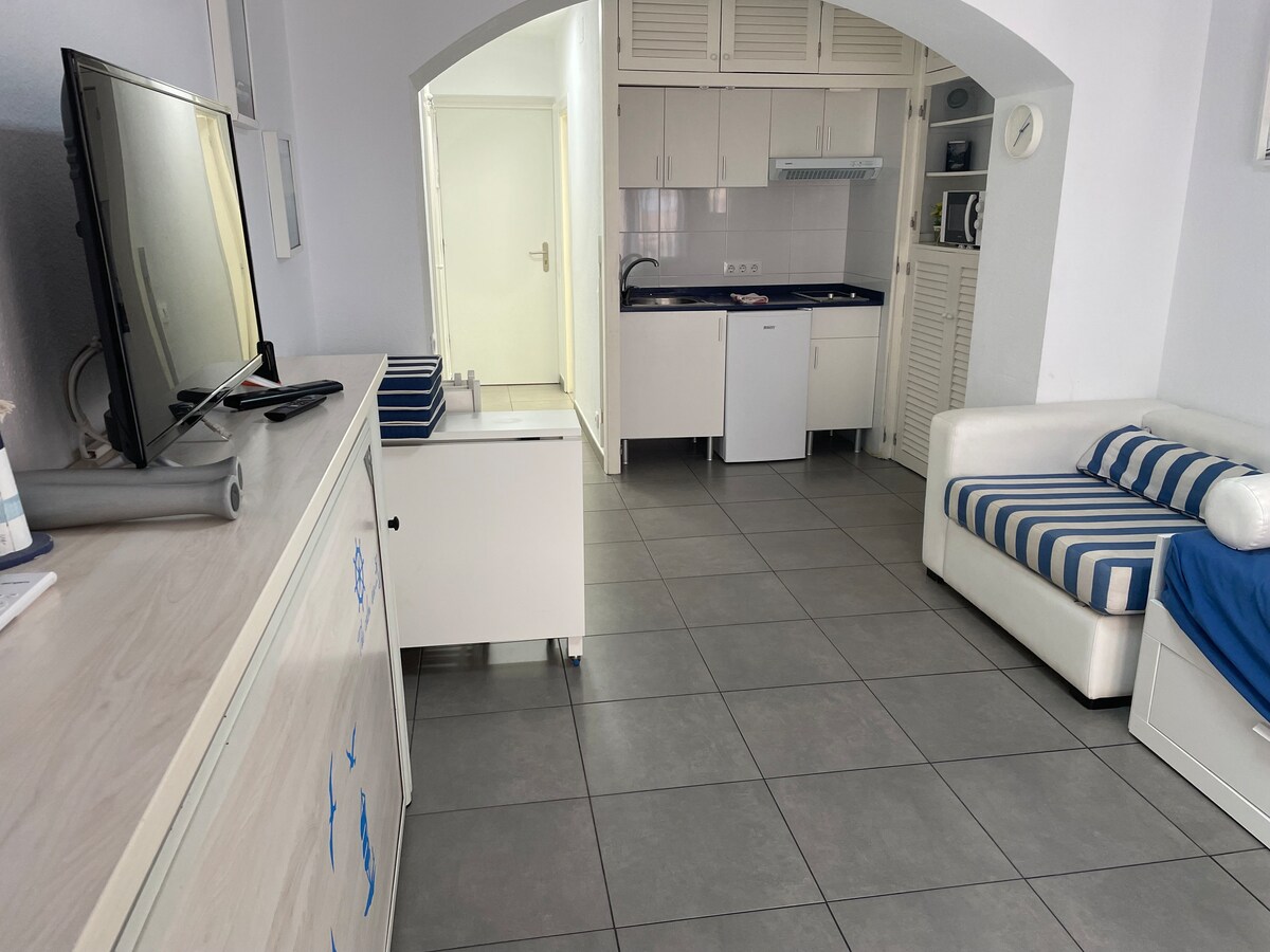 Studio cantik yang serba lengkap dengan pemandangan laut yang menakjubkan. Semuanya ada: cadar, tuala, WiFi, keperluan mandian & pantai, alat memasak. Terletak di tingkat 7 dengan pemandangan taman, kolam renang, terusan dan laut yang indah. 3 kolam renang yang dikawal dibuka pertengahan Mei hingga pertengahan Oktober, 2 gelanggang tenis, kawasan permainan kanak-kanak, taman, bar, kedai arak, restoran, pasar raya. Tempat letak kereta percuma. 5 minit dari pantai Santa Margarida. Sesuai untuk kanak-kanak. Tiada HAIWAN PELIHARAAN: Saya ALAH. Saya ada flat lain di mana mereka dialu-alukan.