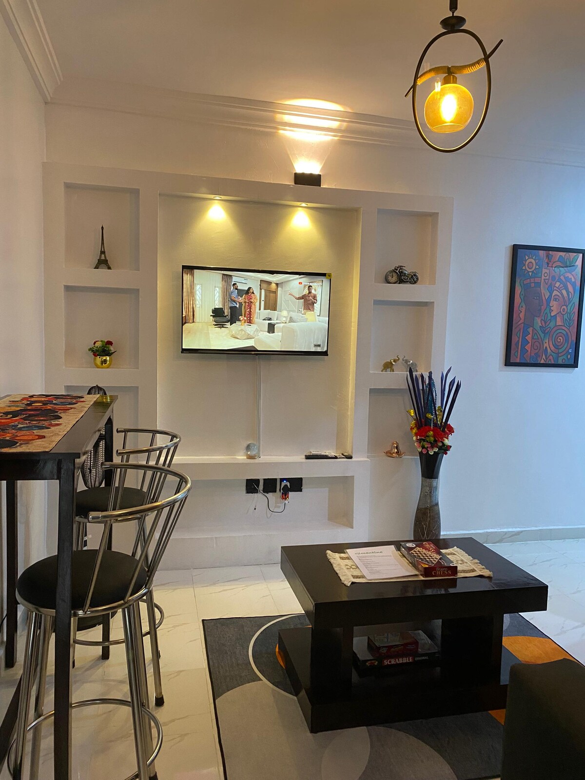 This unique place has a style all its own. It’s a 1-bedroom and sitting room serviced apartment. Amenities include ; - 24/7 power supply - Smoke extractor -Microwave - CCTV camera - DSTV/Netflix -TV console -water heater - snooker board - table tennis - washing machine - Large parking space - Reading chairs and tables - Gas cooker -Freezer